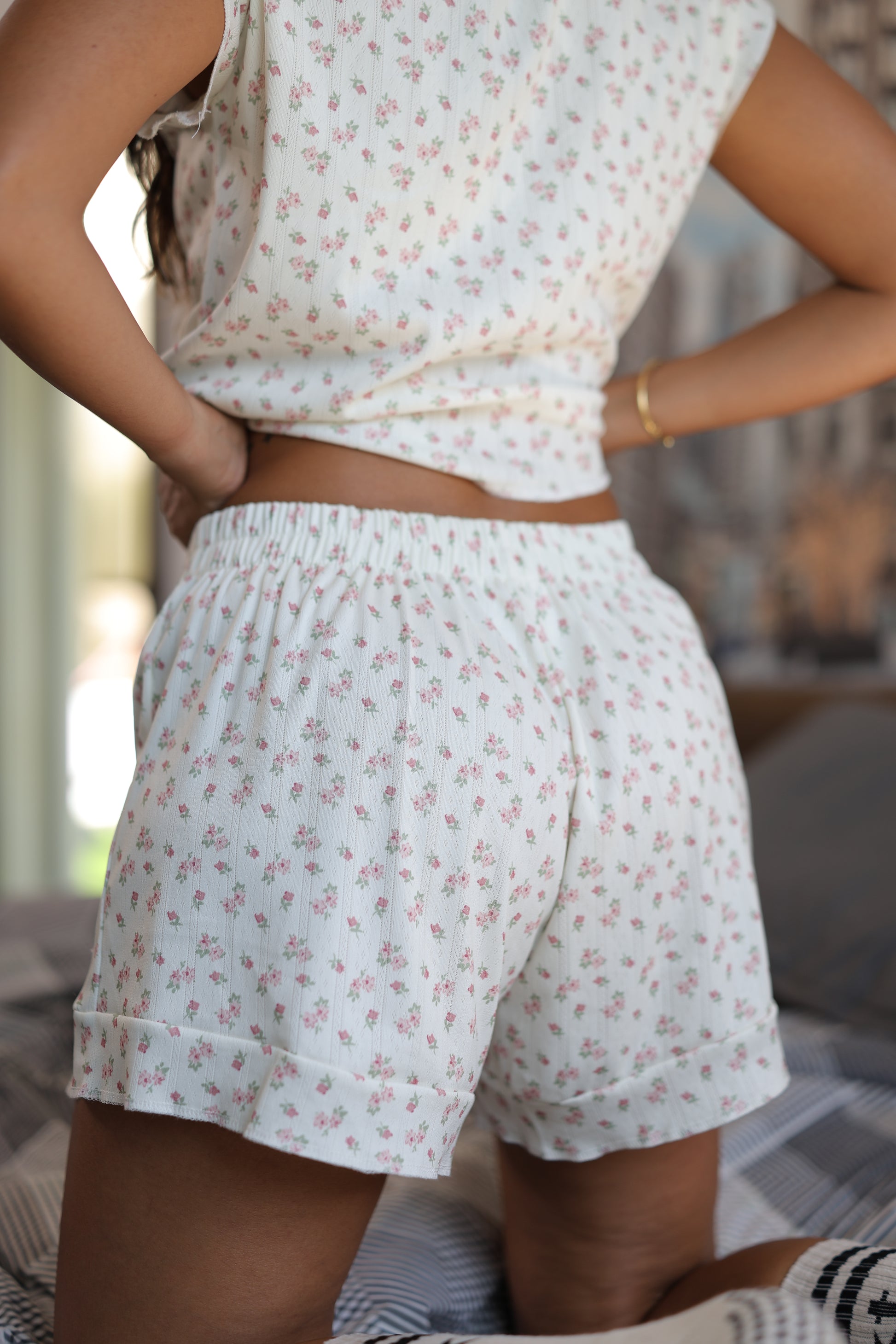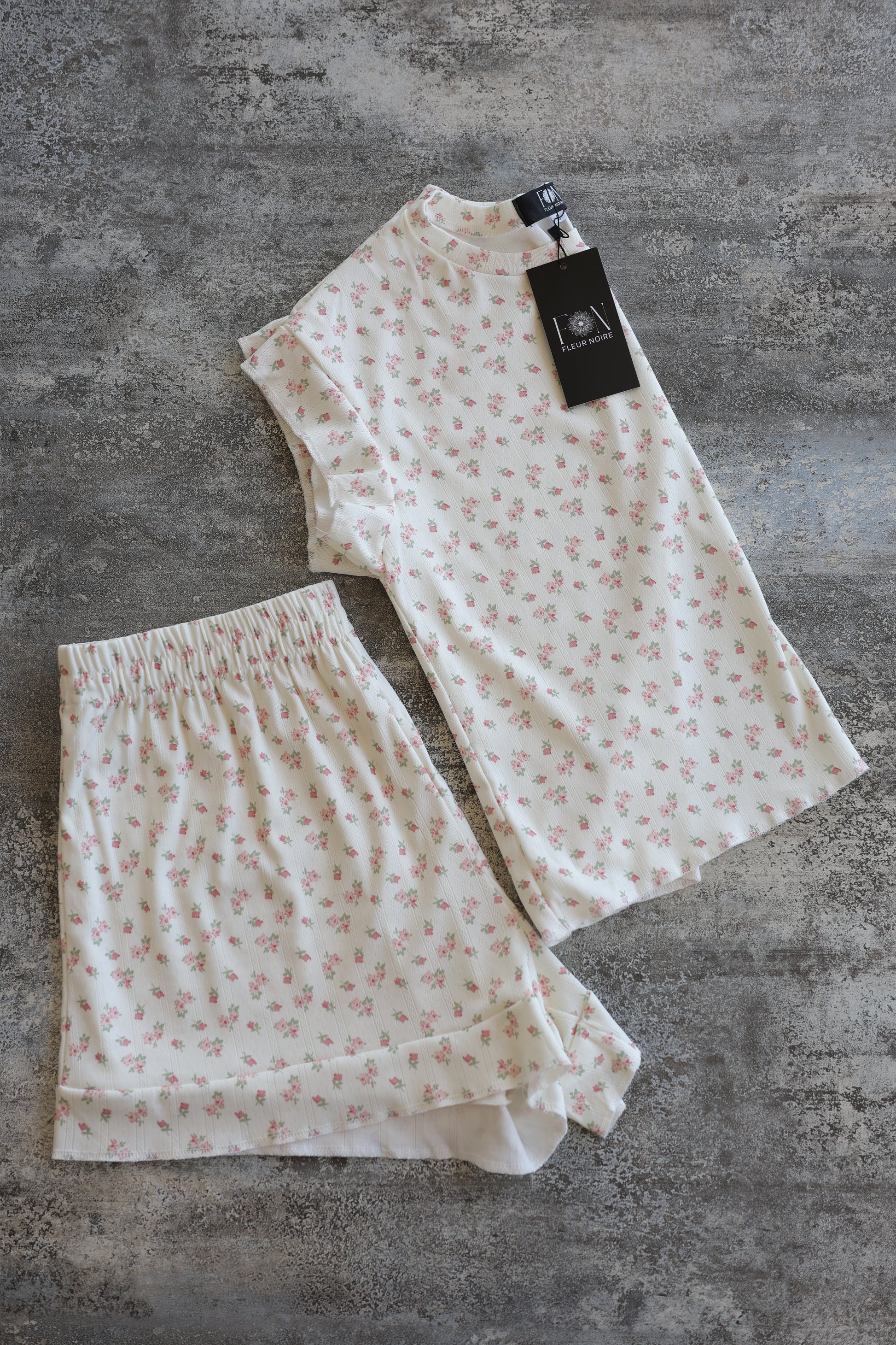 Slip into serenity with the Peony Set — a romantic floral co-ord that blends playful charm with delicate elegance. The top features flutter sleeves and a gentle front tie, revealing just a hint of midriff, while the high-waisted shorts sway softly with every step. Perfect for slow mornings and soft sunsets.